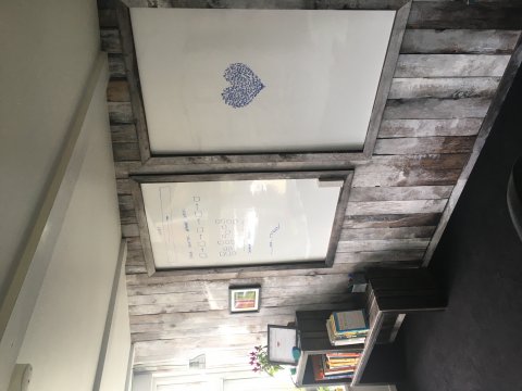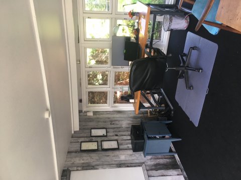 Dette kontor er bygget af 80% genbrugsmaterialer fra en teaterscenografi (den grå væg) samt gamle vinduer, der fik en overhaling.