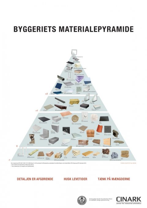 Til inspiration kan du selv bruge materialepyramiden herunder, der er en nem måde til hurtigt at vurdere, hvilke materialer der belaster miljøet mest … og mindst.